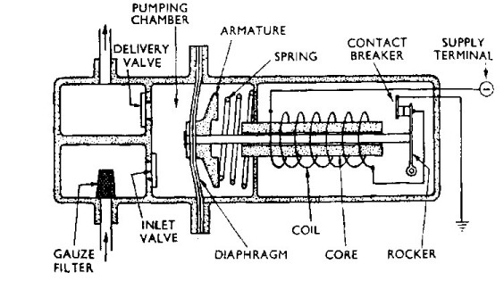 - As the armature reaches the end of its stroke the contacts are forced open by the rod and rocker arrangement attached to the armature. The solenoid demagnetises and the spring propels the armature and diaphragm to its resting position, thus expelling petrol through the delivery valve to the carburettors. The contacts are remade to restart the cycle. The mechanical arrangement of the contact mechanism and inertia of the moving components ensure a sufficient throw of the diaphragm to pump effectively.